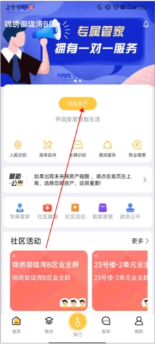 打开安居公社这款应用;进入首页后,在首页里点击“添加房产”选项,具体操作可参照图示。