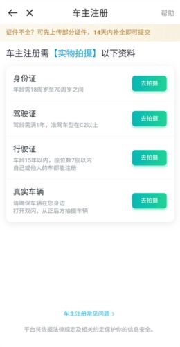 最后按要求【拍摄上传】身份证、驾驶证、行驶证以及真实车辆的照片,待审核通过后,就能成功注册成为滴滴网约车司机了。