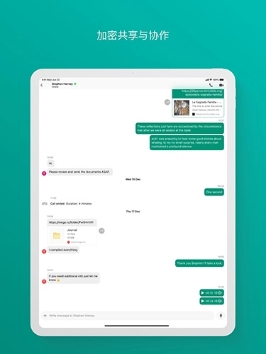 聊天记录能在多台设备间自动同步,您也可以在聊天时添加文件,或者从您的MEGA云盘里选择添加文件。