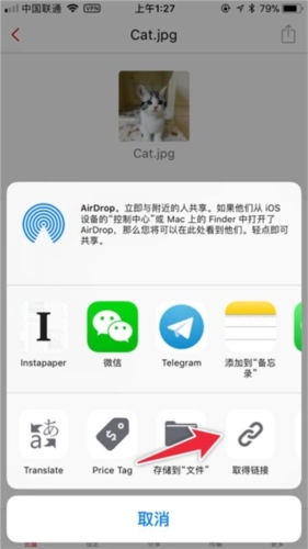 首先要获取链接,具体操作是长按需要分享的文件,此时底部会弹出相关选项,用户只需点击选项里的【获得链接】即可。