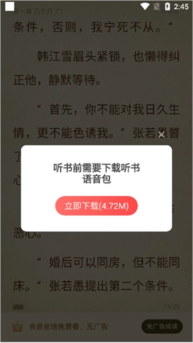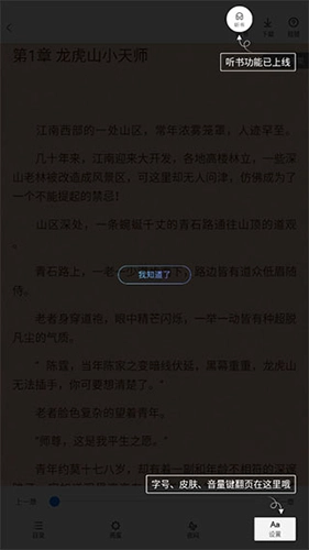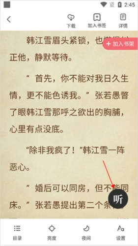 听书模式仅支持有语音包的小说设置。用户可进入小说阅读页面,点击右上角的菜单选项,若页面显示【听】图标(如以下红色箭头所指位置),则表示该小说支持开启听书模式。
