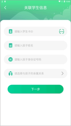 如果您是家长,需要填写学生卡ID、姓名、身份证号以及亲属关系信息。