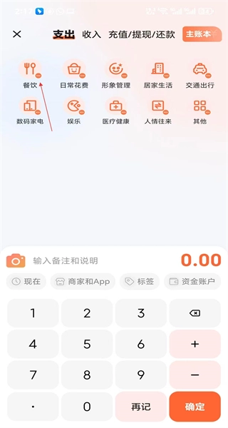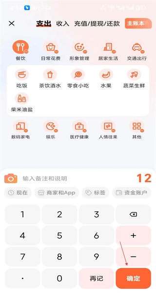 在餐饮分类里选定具体类型,输入12元的支出金额,点击确定按钮,就能完成这笔餐饮支出的记录啦。