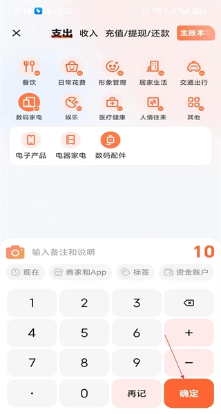 再次进入支出记录页面,选择数码家电分类,输入支出金额10,点击确定按钮记录该笔支出。