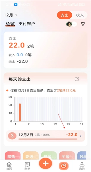 完成支出记录后回到软件首页,在总览板块可以查看12月3日的支出合计以及相关统计信息。