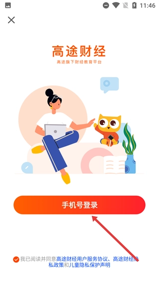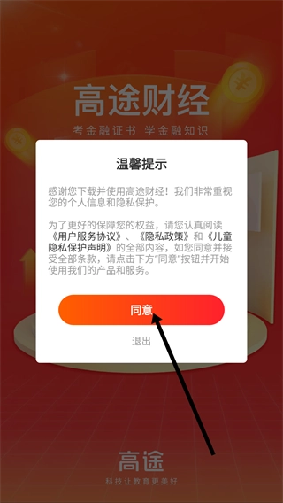 进入【高途财经】界面后,请先仔细阅读【用户服务协议】、【隐私政策】及【儿童隐私保护声明】,随后点击弹窗里的【同意】按钮,即可使用该产品的相关服务。