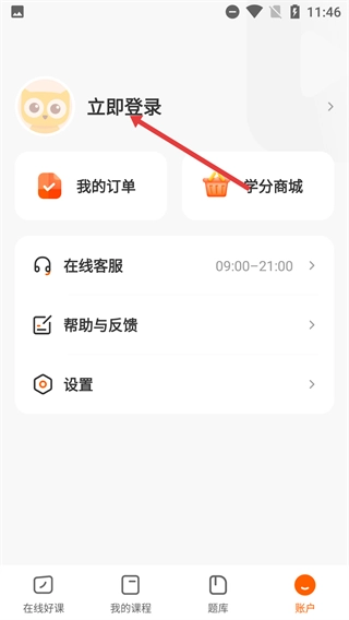 进入【账户】页面后,能看到【我的订单】、【学分商城】等功能入口,点击【立即登录】按钮即可进入登录流程。