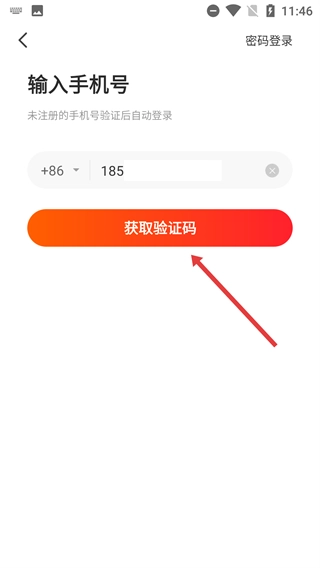 进入【输入手机号】页面后,先选择【+86】这个区号,接着填写对应的手机号码,然后点击【获取验证码】按钮来获取登录时需要的验证信息。