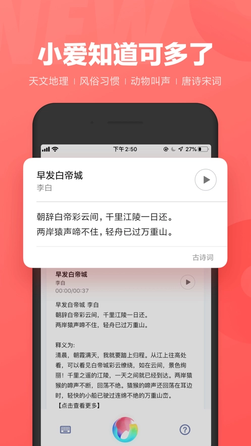 是一款由小米出品的一款基于语音交互的人工智能助理软件。该应用与小爱同学人工智能交互引擎结合,支持智能家居控制、音乐播放、闹钟设置等功能,并具有丰富的技能覆盖内容、工具和互动等多个领域。用户可以通过手机与小爱同学进行对话交流,享受到沉浸式的对话形态和全新的沟通体验。此外,小爱同学还通过更新不断提升上下文理解能力,使得AI可以更好地理解用户的需求,为用户带来便利和娱乐。小爱写诗