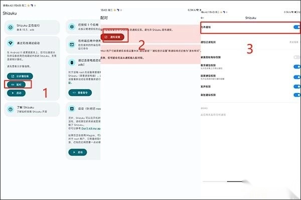安装好ShizukuRunner后,打开该软件,接着点击配对选项,然后进入通知设置页面,最后开启允许通知的权限。