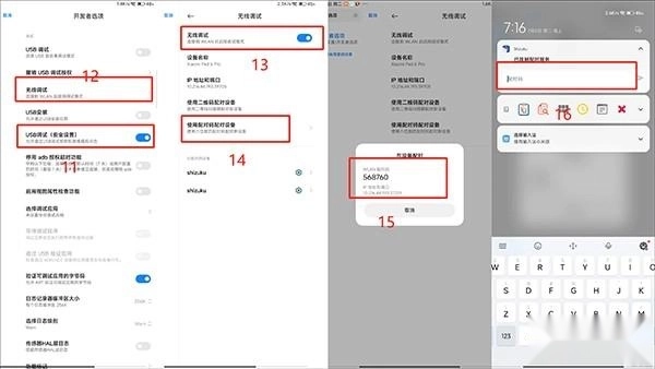 ——开启USB调试(安全设置) ——开启无线调试 ——选择通过配对码进行配对设置 ——在控制栏输入配对码