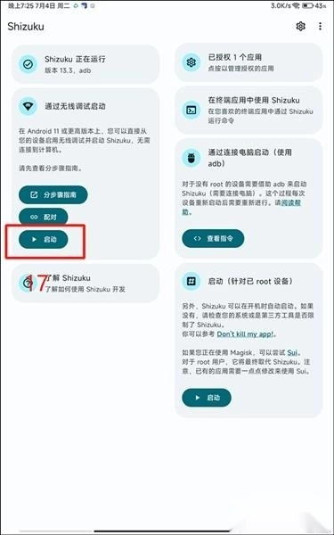 启动(针对已root设备)1.此外,shizuku能够在开机时自动启动。要是没有自动启动,请检查您的系统或者第三方工具是否设置了限制。