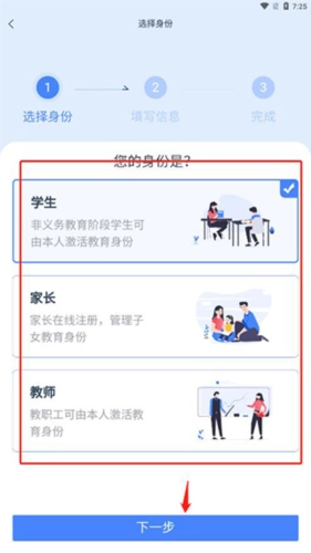 进入注册界面后,您可以选择对应的身份类型:如果是学生本人注册,请选择“学生”身份;如果是家长代为注册,则选择“家长”身份。