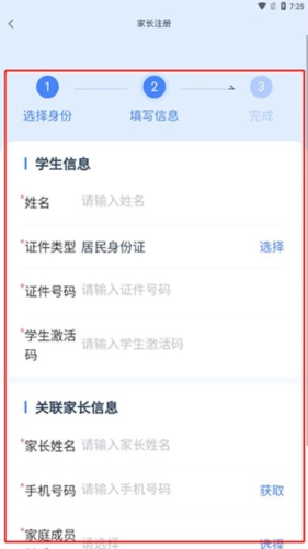 接着补充完整需要填写的信息,像学生的姓名、证件号码、激活码,以及家长的相关信息,之后点击下一步就可以完成激活了!