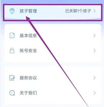 在手机上打开,进入后,在我的界面,点击孩子管理。