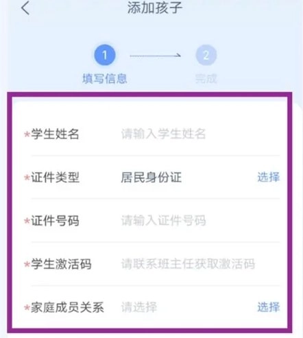 接下来,在进入添加孩子的界面后,填写好孩子的相关信息以及学生激活码,随后点击“下一步”按钮,就能完成孩子的重新绑定操作。
