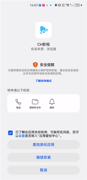 3、点击勾选“已了解此应用未经检测……”,点击“继续安装”。