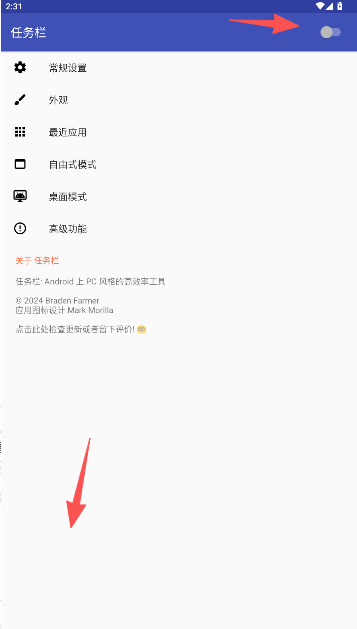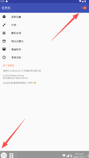 《任务栏 taskbarv3.6 安卓版》是一款专为安卓系统平台打造的布局工具,它具备丰富多样的配置选项。借助该工具,用户能够对当下的桌面系统布局加以调整,不再仅仅局限于传统的置顶显示、侧边显示或其他界面展示方式。在使用时,用户可依据自身的使用习惯,大胆尝试不同的布局参数设置,只需点击开关,就能迅速完成操作,无需进行其他额外步骤,简单便捷又实用,欢迎使用!