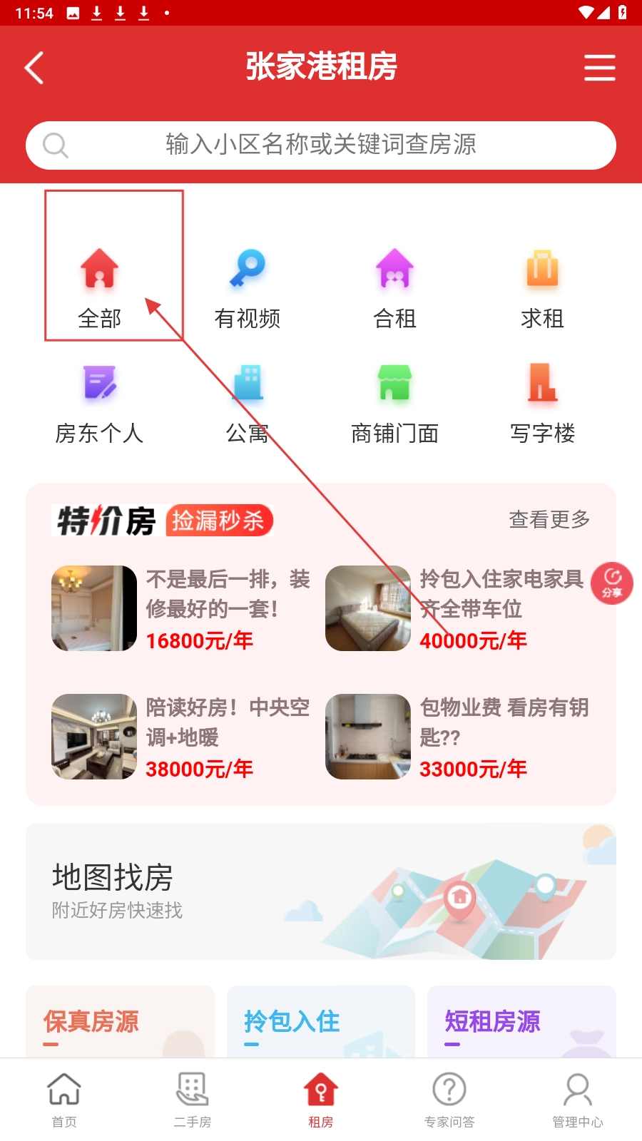 2、在租房页面,点击【全部】选项,查看所有租房房源信息。