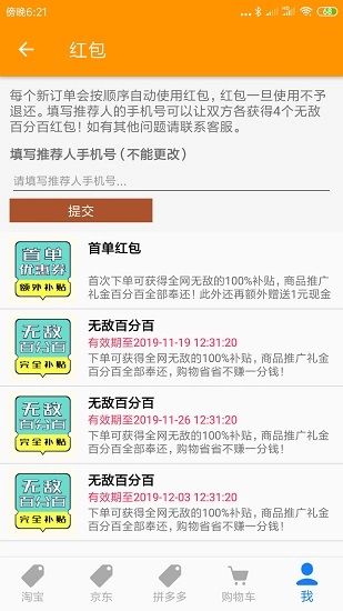 请先领取优惠券后购买,确认收货后还可获得现金补贴。随时查询到每一笔订单的补贴收益,随时可以将补贴提现。