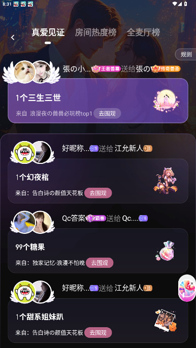 1、单次送礼金额大于等于200钻石,将出现在真爱列表里