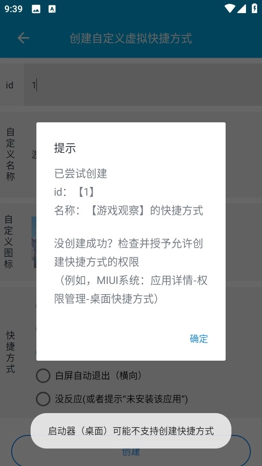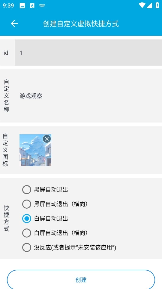 3、接下来自定义输入id、名称、图标,并且选择一个快捷方式后,点击【创建】。