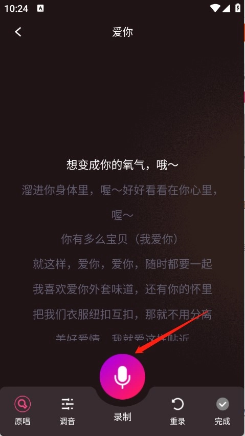 2、在演唱页面中可以进行看歌词唱歌,并且还可以快速的录制;
