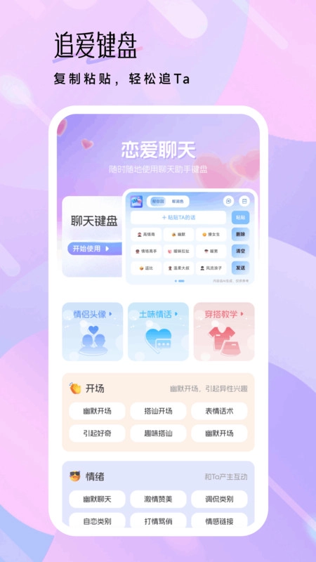 1、在首页中提供了情侣头像、土味情话、穿搭教学,同时还有开场以及情绪的话语;