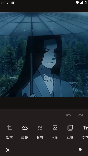 进入图片编辑界面后,可使用“裁剪”“滤镜”“调节”“抠图”“贴纸”“文字”等工具对图片进行基础编辑。