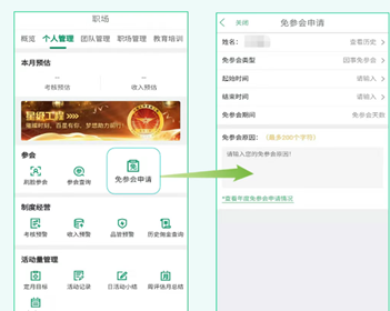E店申请+纸质申请系统申请路径:国寿E店-【职场】-【个人管理】-【参会】栏目点击【免参会申请】,同步提交纸质假单+证明资料至个职场助理作为审批依据及存档备查