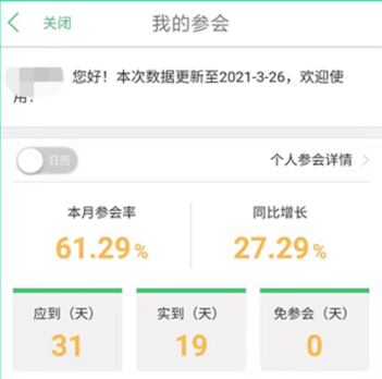 在参会查询页面可进行个人参会情况查询、本月参会率、同比增长情况、应到天数、实到天数、免参会天数及免参会申请