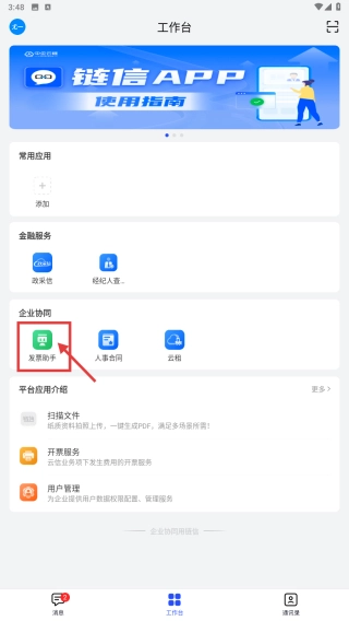 1、打开链信应用,点击底部工作台选项,进入工作台页面。