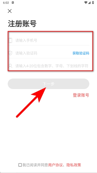4、按顺序输入手机号码、验证码,设置满足要求的账号信息,勾选同意用户协议及隐私政策,随后点击下一步,即可完成注册。