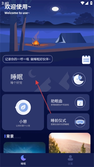 1、进入帮助睡眠主页面,点击睡眠,进入睡眠设置页面。