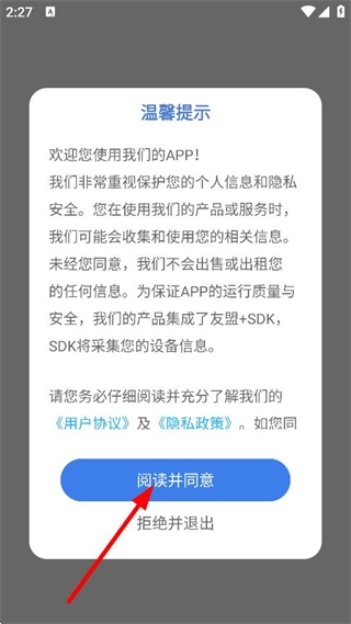 1、在温馨提示的弹窗中,点击阅读并同意,进入早闻天下事主页面。