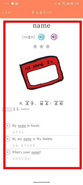 4、进入背单词界面,查看单词的发音、释义、例句等内容。