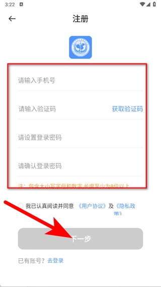 4、输入手机号,点击获取验证码,填入收到的验证码等信息,勾选后,点击下一步,完成注册登录。