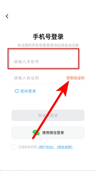 3、在手机号登录页面输入手机号码,点击获取验证码。