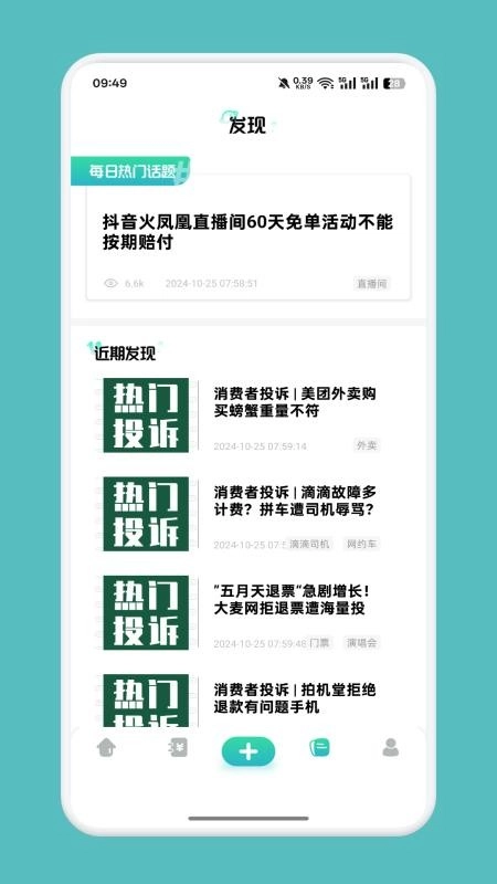 4、进入到发现页面中可以对近期发现的各种消费投诉资讯内容进行查看了解;