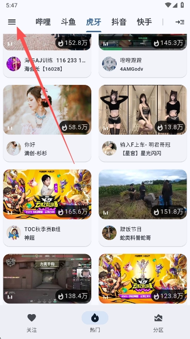 2、点击“热门”,即可获取各个平台的推荐直播。