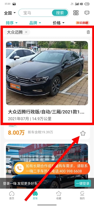 4、完成品牌和车系选择后,查看对应的车辆资源,喜欢的点击收藏。