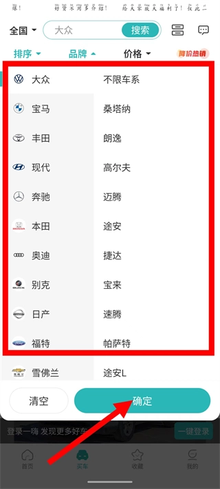 3、在品牌选择界面,选择想要的汽车品牌及具体车系,点击确定。