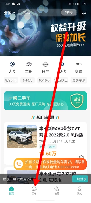 1、打开一嗨二手车,点击底部导航栏的买车选项。