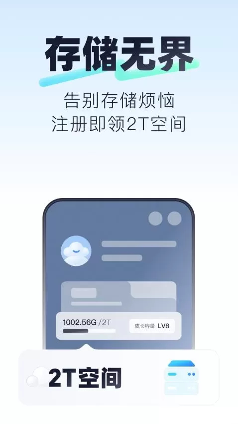 无套路、,注册即送永久免费2T存储空间,文件上传全程不限速,让用户无需等待,完成文件传输。