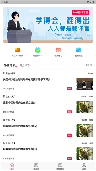 佩琪翻译,是北京佩琪教育科技有限公司专为学员精心打造的一款翻译学习工具类软件。这款软件拥有海量词汇与真题题库,用户能在此自由背单词,锻炼自身对单词的运用能力。软件内每个单词都配有中文释义和标准英文发音,助力用户提升发音水平。此外,软件还提供双语外刊,让用户在学习英语之际,还能了解时事、放松心情。有需求的朋友们,快来体验吧!