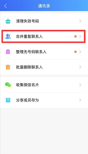 请在右下角【我的】菜单中,找到【通讯录管理】选项,其中就有“合并重复联系人”功能,点击进入后,按照指引操作即可。