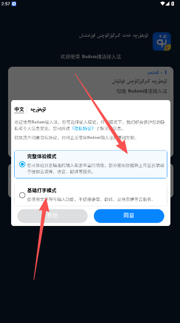 1、进入安装后的使用界面首页,可选择完整体验模式或基础打字模式。基础打字模式是单纯的输入法,完整体验模式则更为综合,建议选择完整体验模式界面,功能更全面。
