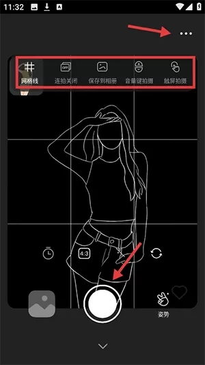4、轻点右上角的三个点,对【网格线】【保存到相册】等功能完成设置后,再点击底部的拍摄按钮来执行拍摄操作。