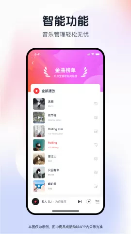 3、智能功能强大,可实现音乐的智能管理,如金曲榜单的呈现等,让音乐管理轻松无忧。