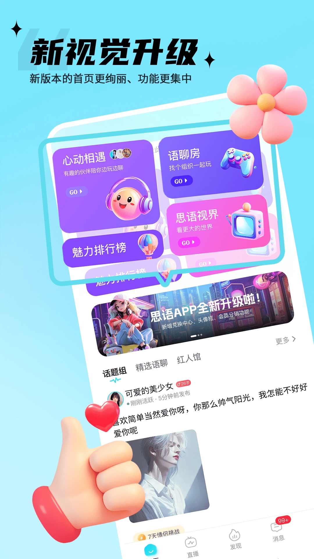思语,一款超棒的聊天社交软件!在这里,用户能享受优质的聊天服务,结识更多志同道合的朋友,获得绝佳的线上社交体验。平台还设有话题广场,感兴趣的朋友,快来加入吧!